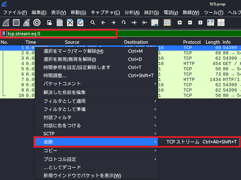 (3) 1番上のパケットを右クリックして[追跡] > [TCP ストリーム]をクリックする。上部のテキストボックスに「tcp.stream eq 0」が入力される。