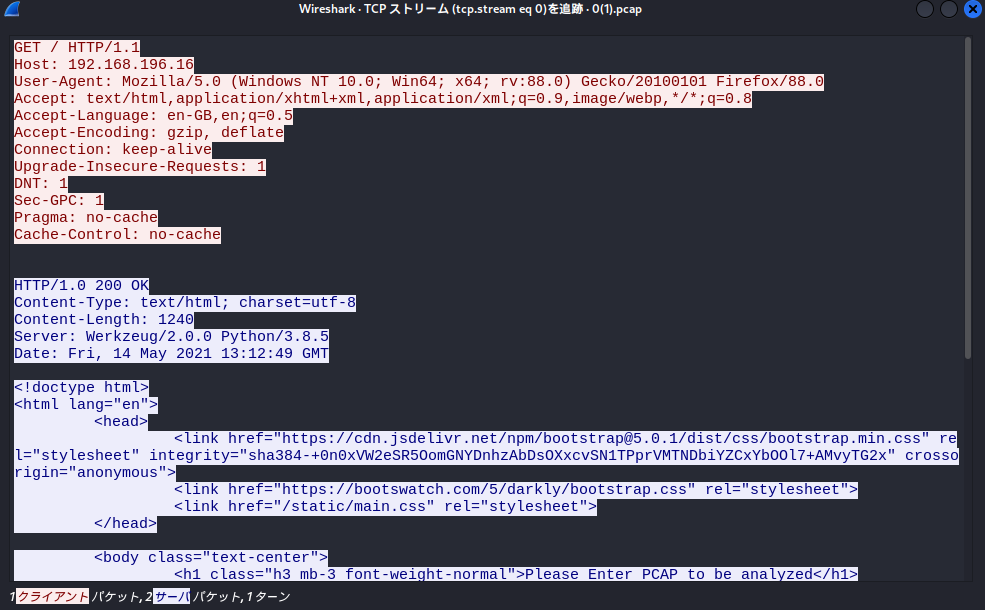 「http://[CapマシンのIPアドレス]/data/0」にアクセスしpcapファイルをダウンロードすると、以下のパケットをキャプチャした通信データである。
