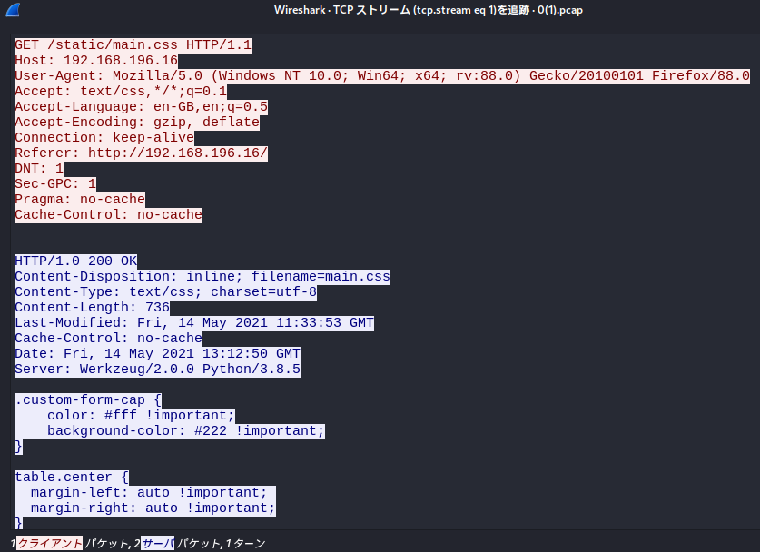 (6) 「http://192.168.196.16/static/main.css へのHTTPアクセス」のパケットが表示される。特に有益な情報はない。