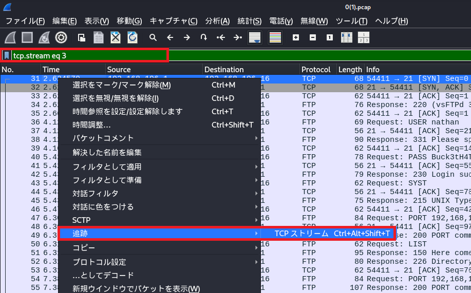 (9) 上部のフィルタのテキストボックスに「tcp.stream eq 3」が入力して、パケットを右クリックして[追跡] > [TCP ストリーム]をクリックする。
