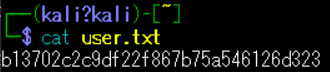 (2) ダウンロードしたファイル(user.txt)をKali Linux側で開くと、一般ユーザーのフラグ文字列が表示される。