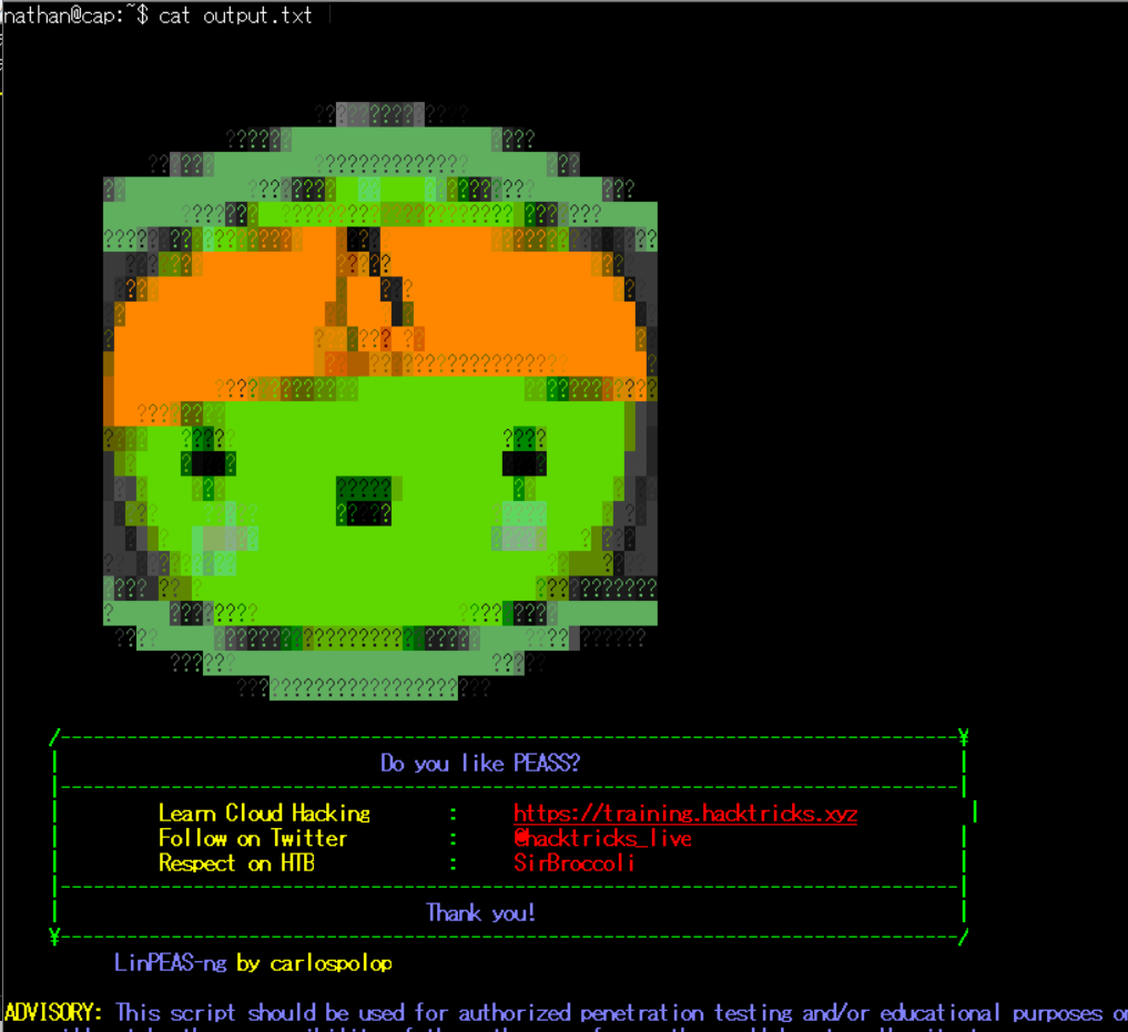 (3) nathanユーザーでSSHログインしたプロンプトにてlinpeas.shを実行する。