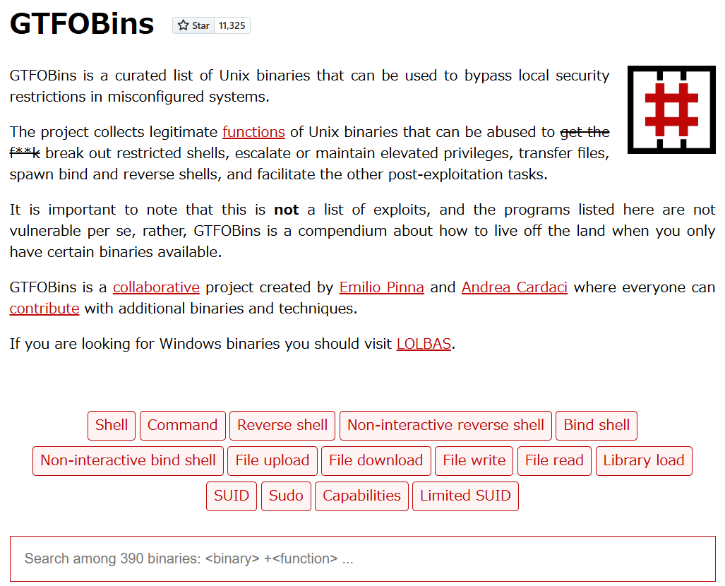 GTFOBinsはLinuxにおけるローカル権限昇格についてまとめたWebサイト。