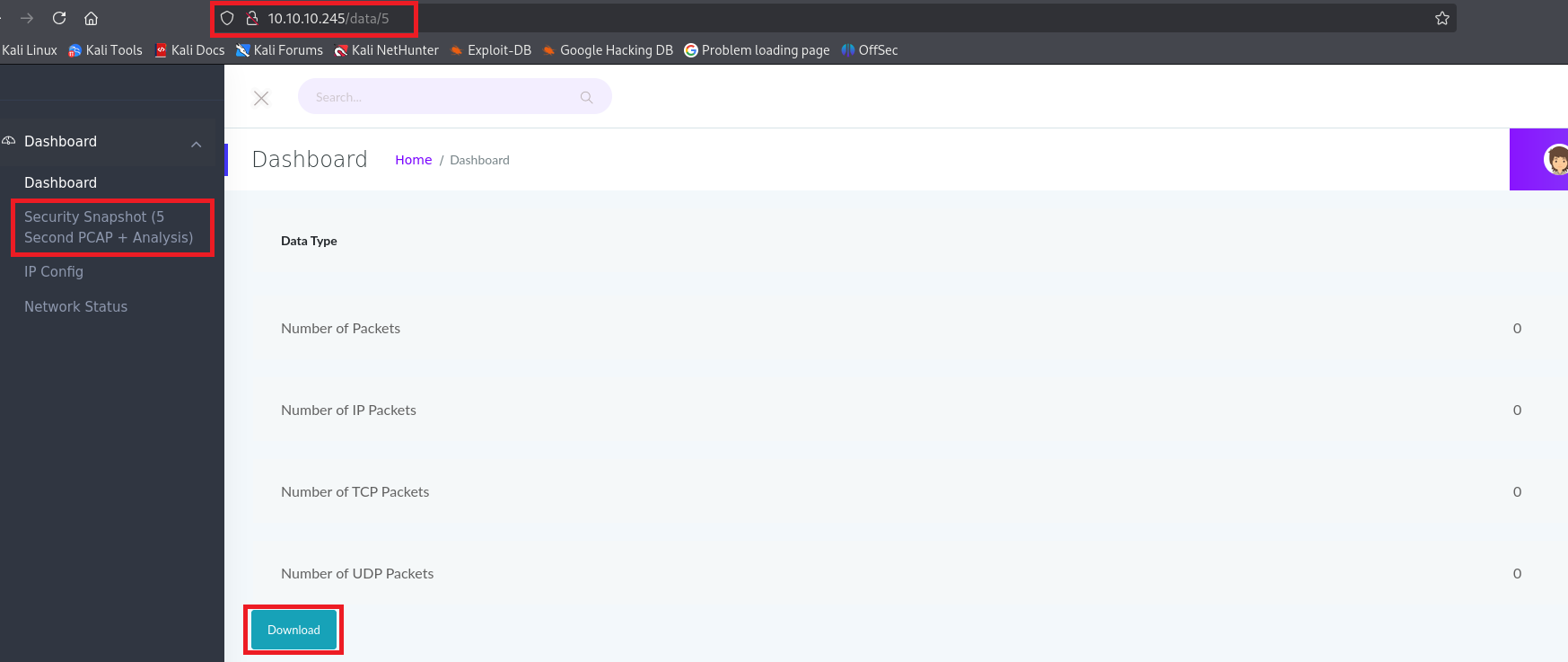 (2) 左部の「Security Snapshot (5 Second PCAP + Analysis)」をクリックすると、「http://10.10.10.245/data/[数字]」にアクセスする。