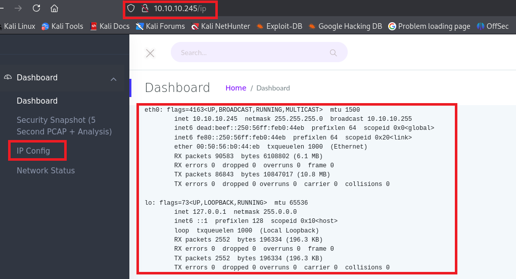 (3) 左部の「IP Config」をクリックすると、「http://10.10.10.245/ip」にアクセスし、「ip a」コマンドの出力結果のような画面が表示される。