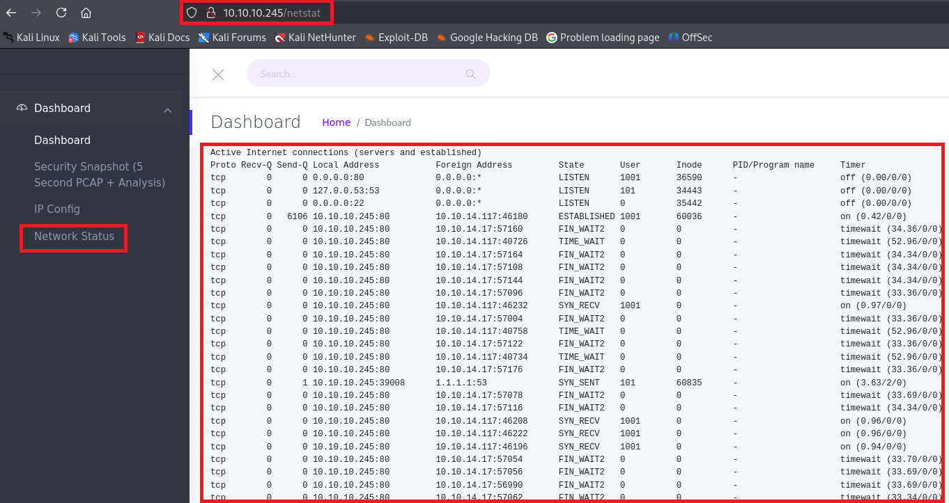 (4) 左部の「Network Status」をクリックすると、「http://10.10.10.245/netstat」にアクセスし、「netstat -an」コマンドの出力結果のような画面が表示される。