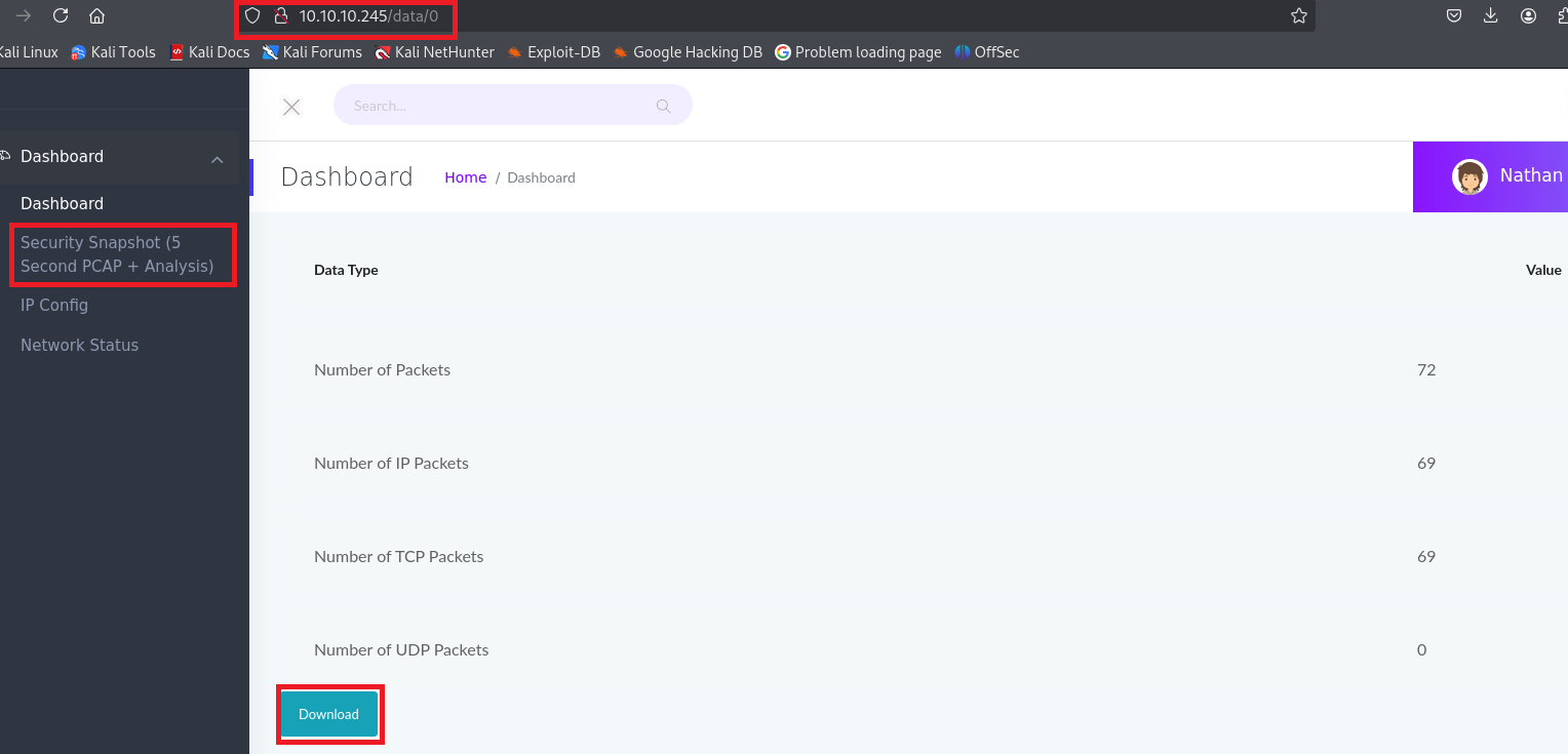 (1) 「http://10.10.10.245/data/0」にアクセスし「Download」をクリックして、pcapファイル(0.pcap)をダウンロードする。