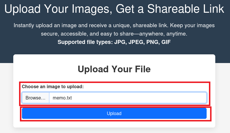 (4) 画像ファイルではない場合、「Supported file types: JPG, JPEG, PNG, GIF!」というメッセージが表示されるため、アップロードするファイルが制限されていることが分かる。