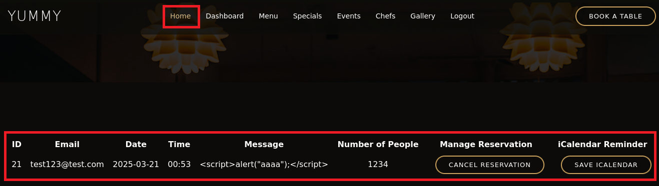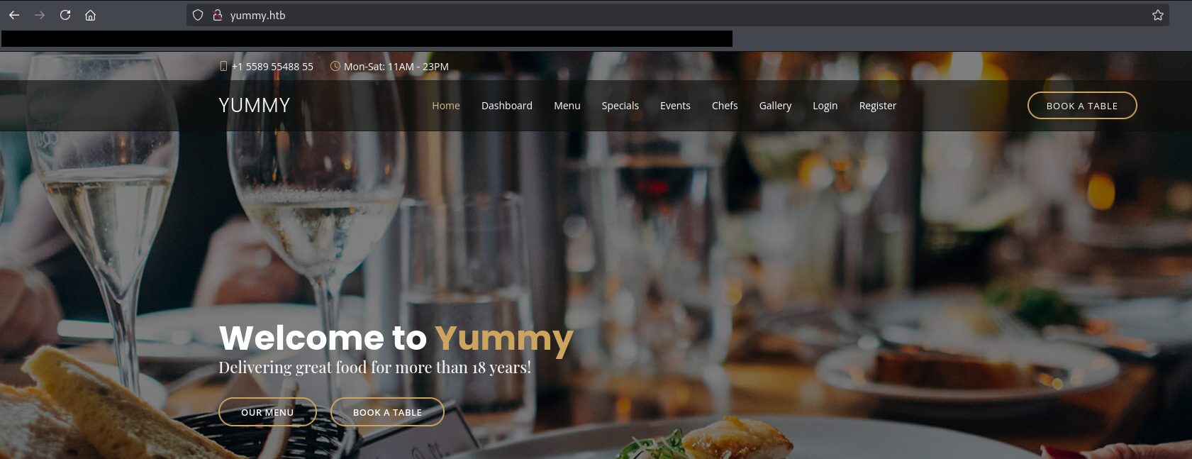 (3) ブラウザを用いて「http://yummy.htb/」にアクセスすると、Webページが表示される。