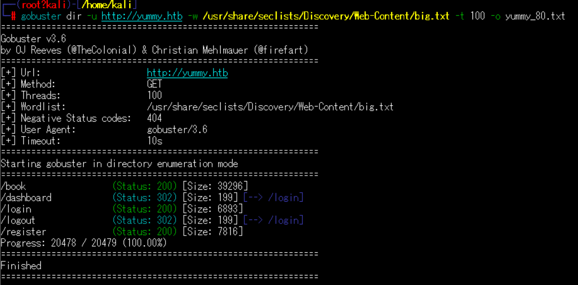 $ gobuster dir -u http://yummy.htb -w /usr/share/seclists/Discovery/Web-Content/big.txt -t 100 -o yummy_80.txt
