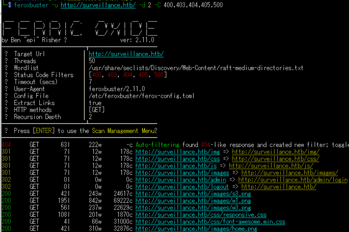 $ feroxbuster -u http://surveillance.htb/ -d 2 -C 400,403,404,405,500
