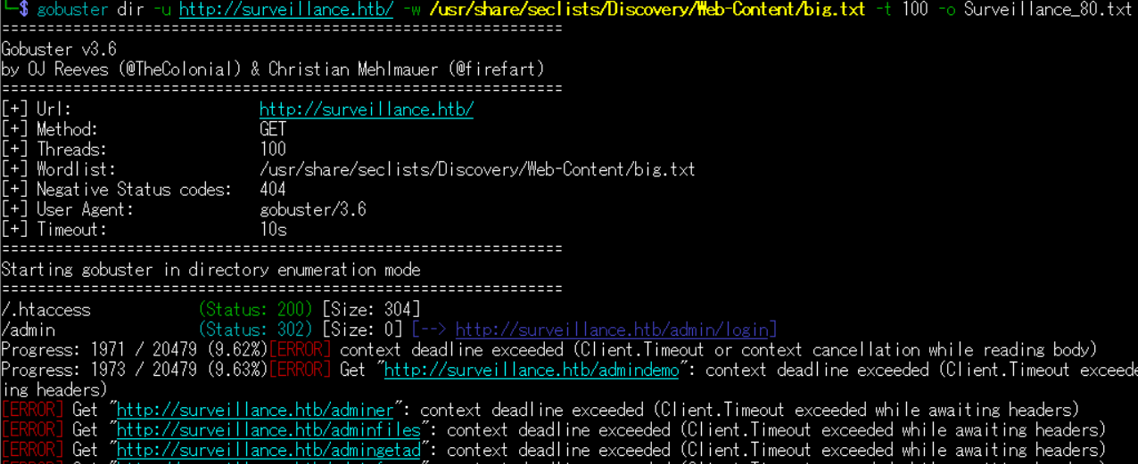 $ gobuster dir -u http://surveillance.htb/ -w /usr/share/seclists/Discovery/Web-Content/big.txt -t 100 -o Surveillance_80.txt