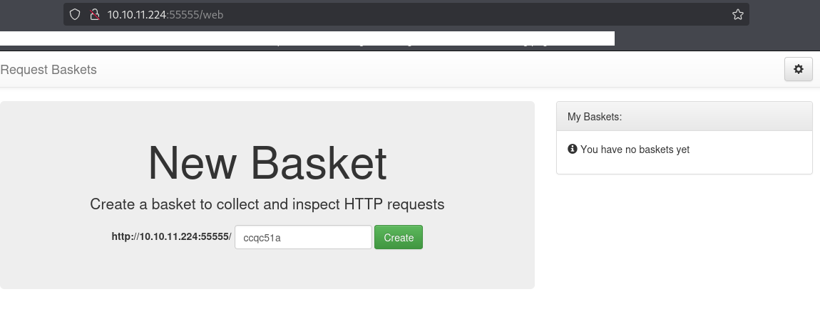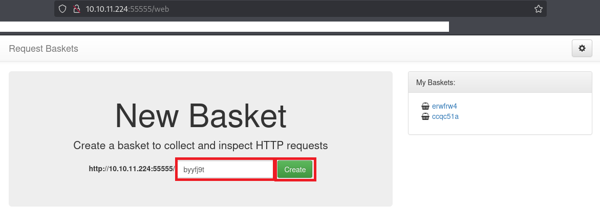 (1) 「http://10.10.11.224:55555/web」にアクセスすると、下部に「Powered by request-baskets | Version: 1.2.1」という表記がある。