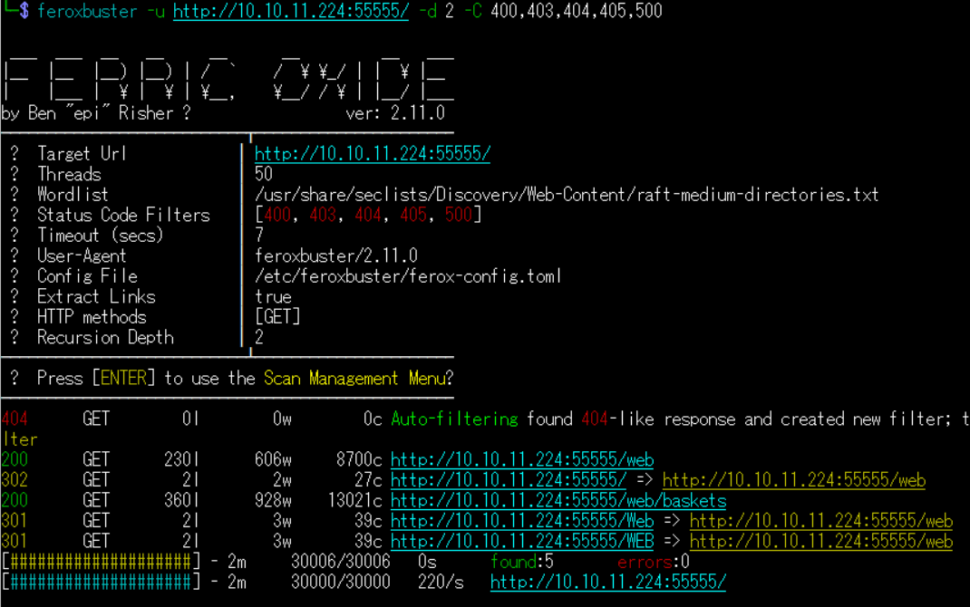 (1) feroxbusterを用いてアクセスできるURLを確認すると、「http://10.10.11.224:55555/web」や「http://10.10.11.224:55555/web/baskets」のアクセス時のHTTPステータスコードが200番(成功)になっていることが分かる。