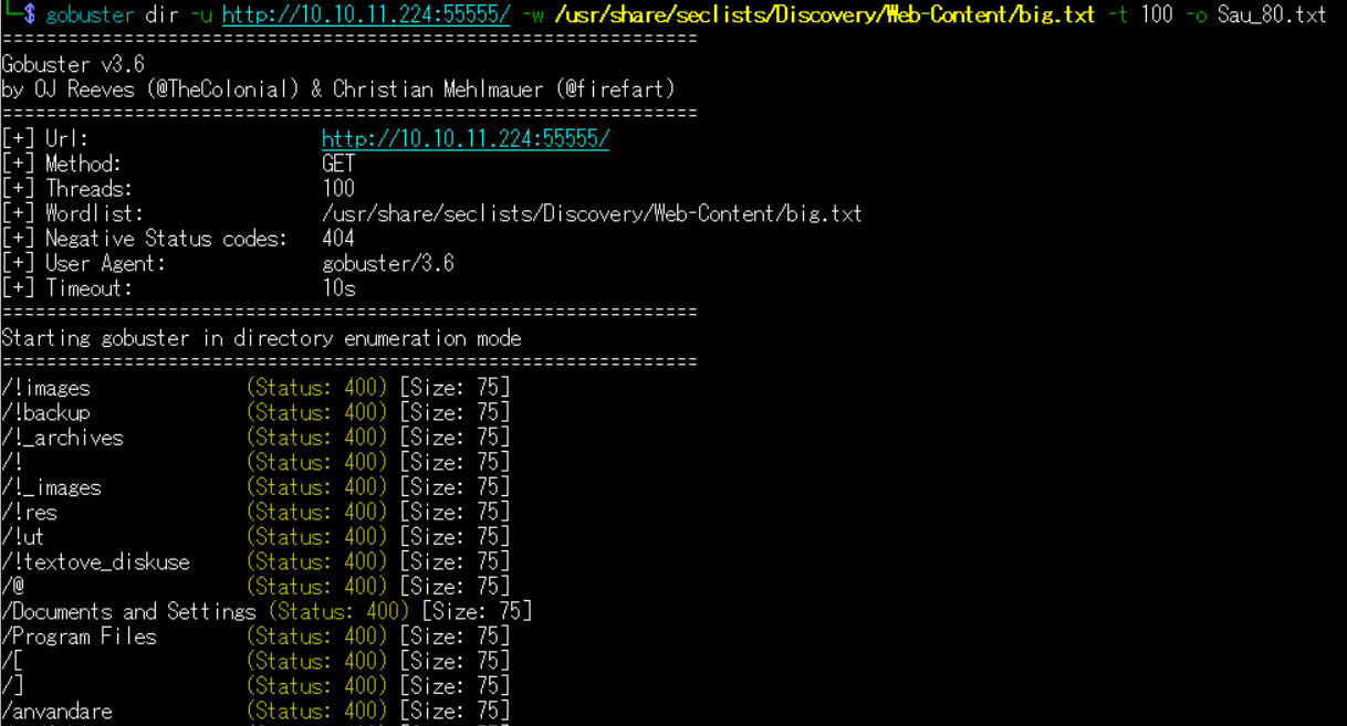 $ gobuster dir -u http://10.10.11.224:55555/ -w /usr/share/seclists/Discovery/Web-Content/big.txt -t 100 -o Sau_80.txt