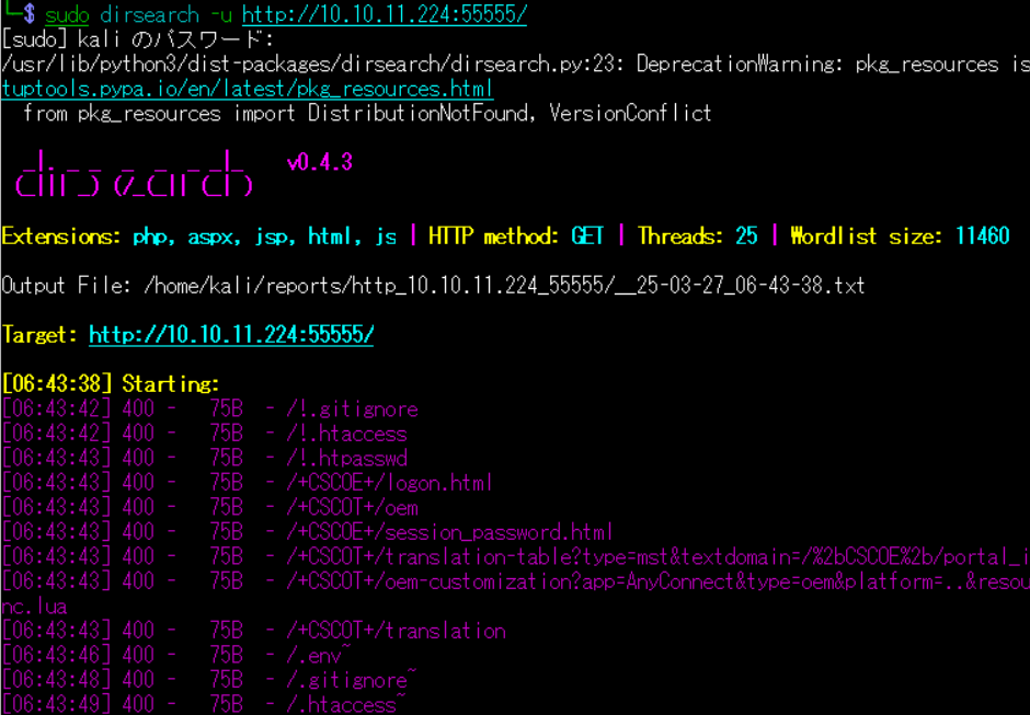 (2) GoBusterを用いてアクセスできるURLを確認すると、「http://10.10.11.224:55555/web」のアクセス時のHTTPステータスコードが200番(成功)になっていることが分かる。