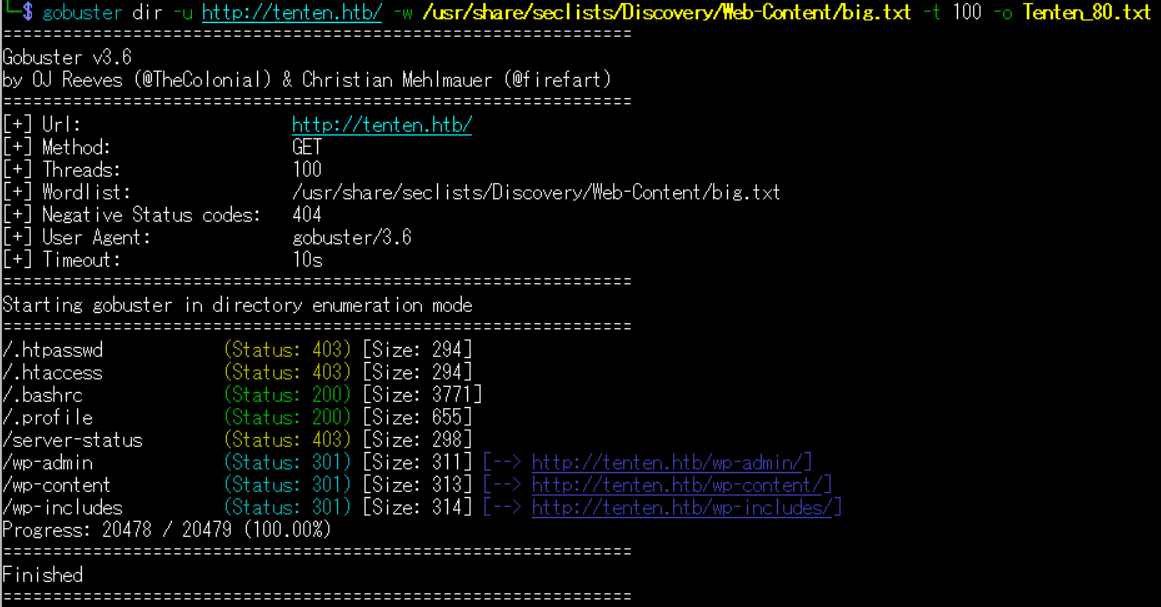 (2) GoBusterを用いてアクセスできるURLを確認すると、「http://tenten.htb/.bashrc」や「http://tenten.htb/.profile」のアクセス時のHTTPステータスコードが200番(成功)になっていることが分かる。