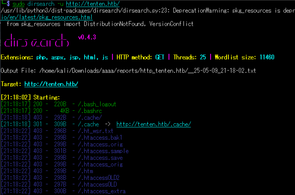 (3) dirsearchを用いてアクセスできるURLを確認すると、「http://tenten.htb/.bash_logout」や「http://tenten.htb/.bashrc」のアクセス時のHTTPステータスコードが200番(成功)になっていることが分かる。。