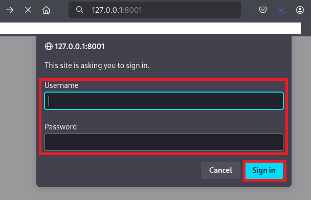 (2) ブラウザを用いて「http://127.0.0.1:8001/」にアクセスすると、ベーシック認証のポップアップが表示される。