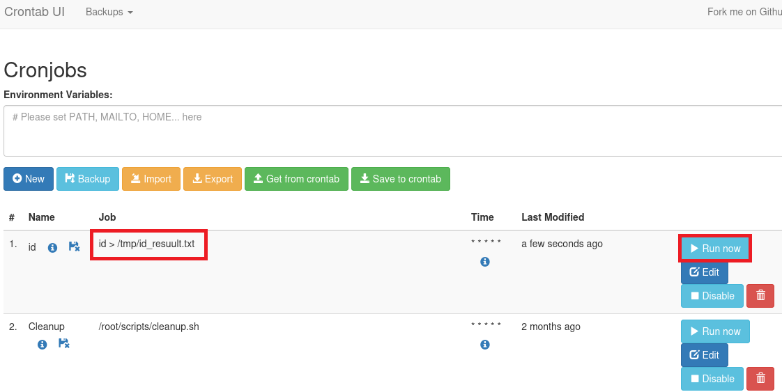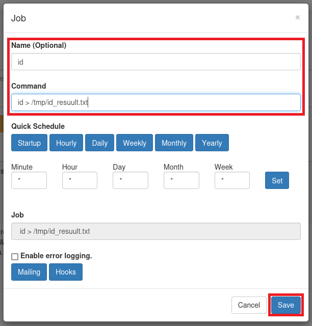 (2) Commandの値に「id > /tmp/id_resuult.txt」を入力して、「Save」をクリックする。