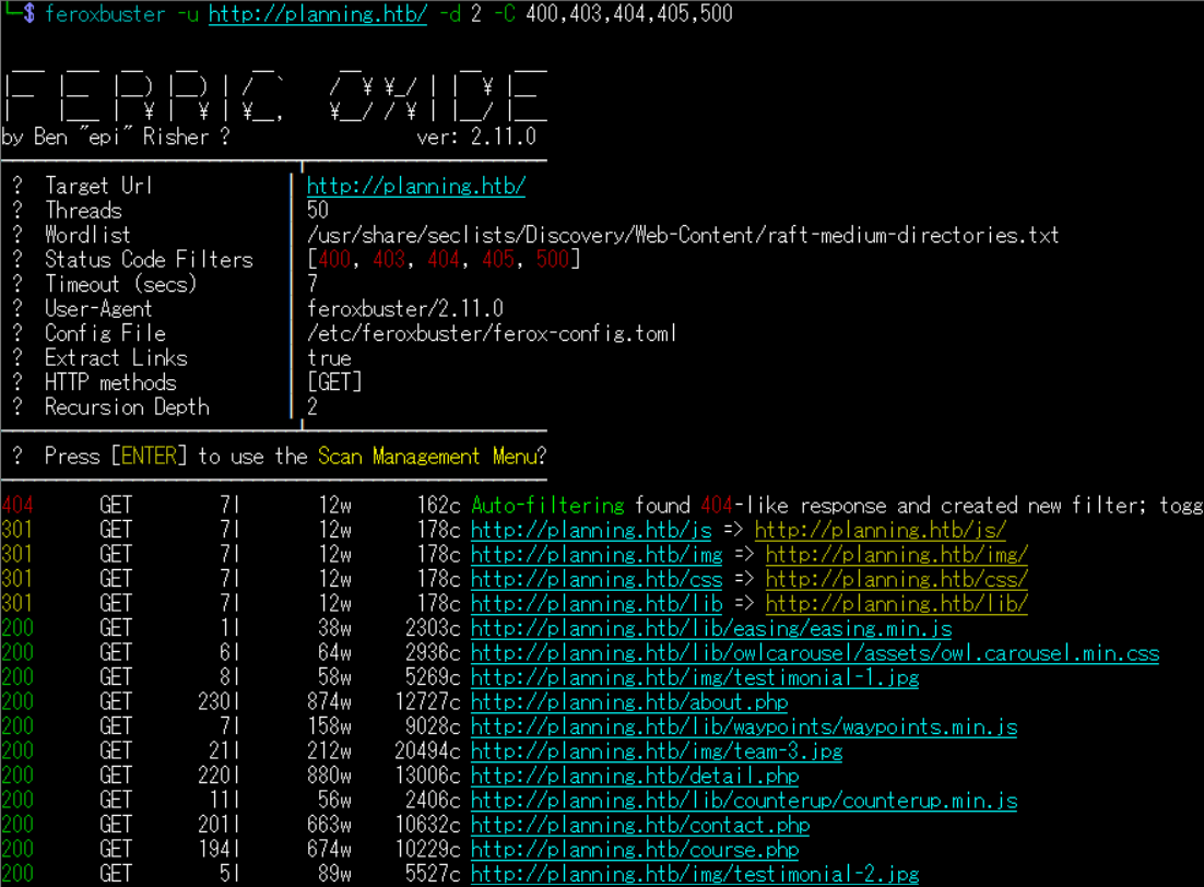 $ feroxbuster -u http://planning.htb/ -d 2 -C 400,403,404,405,500