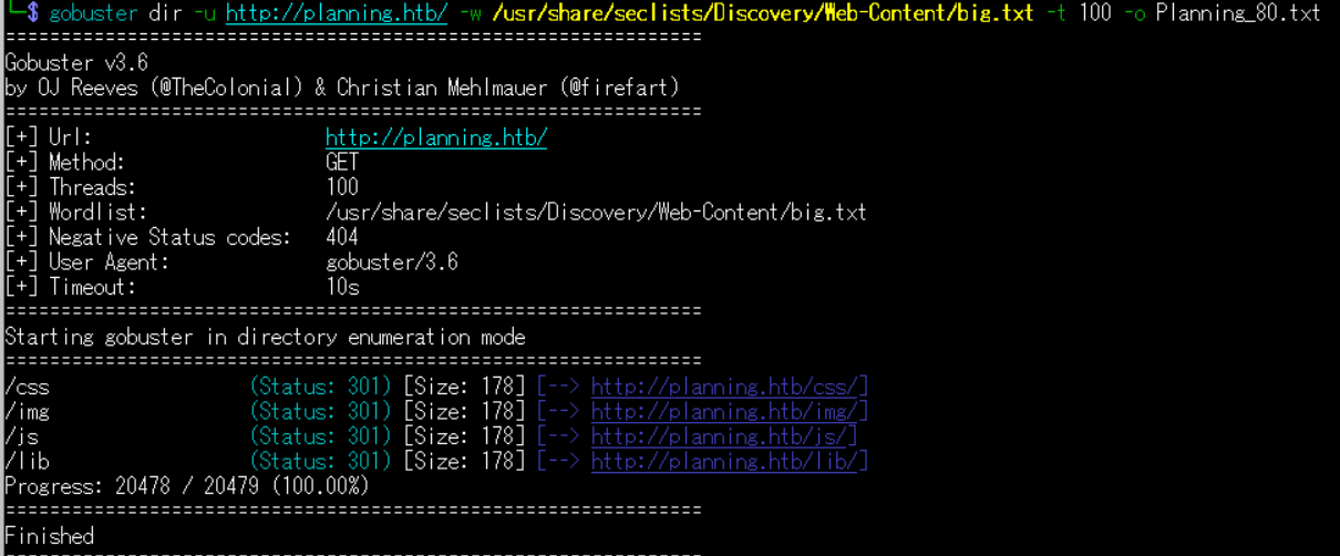 $ gobuster dir -u http://planning.htb/ -w /usr/share/seclists/Discovery/Web-Content/big.txt -t 100 -o Planning_80.txt