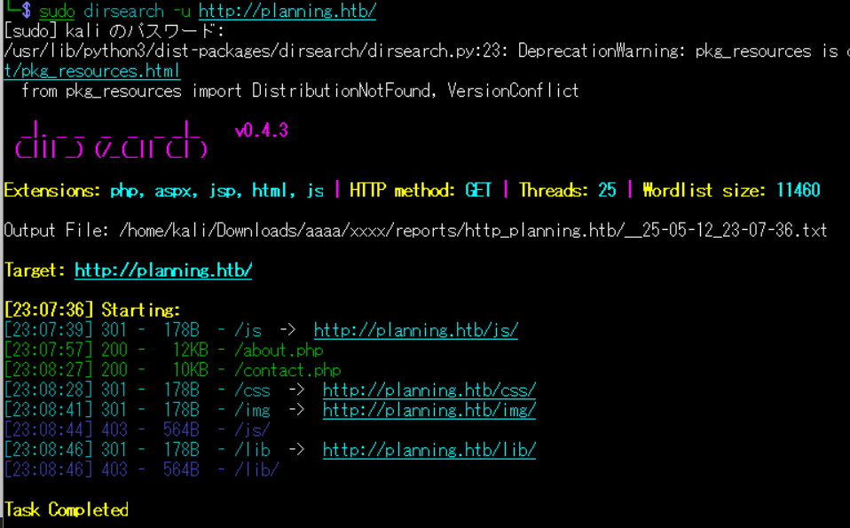 (3) dirsearchを用いてアクセスできるURLを確認すると、「http://planning.htb/about.php」や「http://planning.htb/contact.php」のアクセス時のHTTPステータスコードが200番(成功)になっていることが分かる。