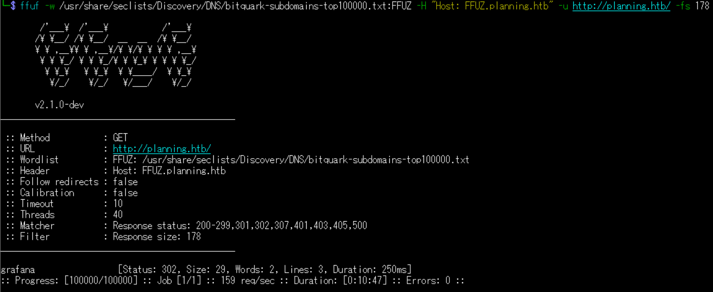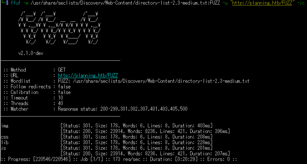 (4) ffufを用いてアクセスできるURLを確認すると、「http://planning.htb/」のアクセス時のHTTPステータスコードが200番(成功)になっていることが分かる。