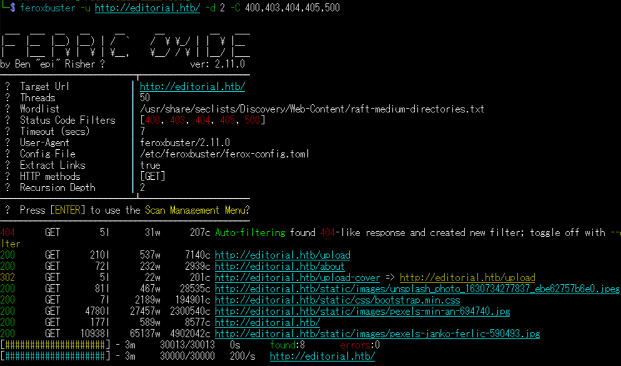 $ feroxbuster -u http://editorial.htb/ -d 2 -C 400,403,404,405,500