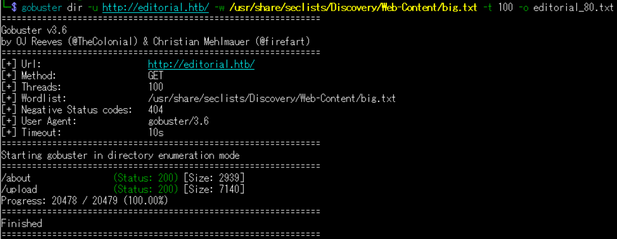 $ gobuster dir -u http://editorial.htb/ -w /usr/share/seclists/Discovery/Web-Content/big.txt -t 100 -o editorial_80.txt