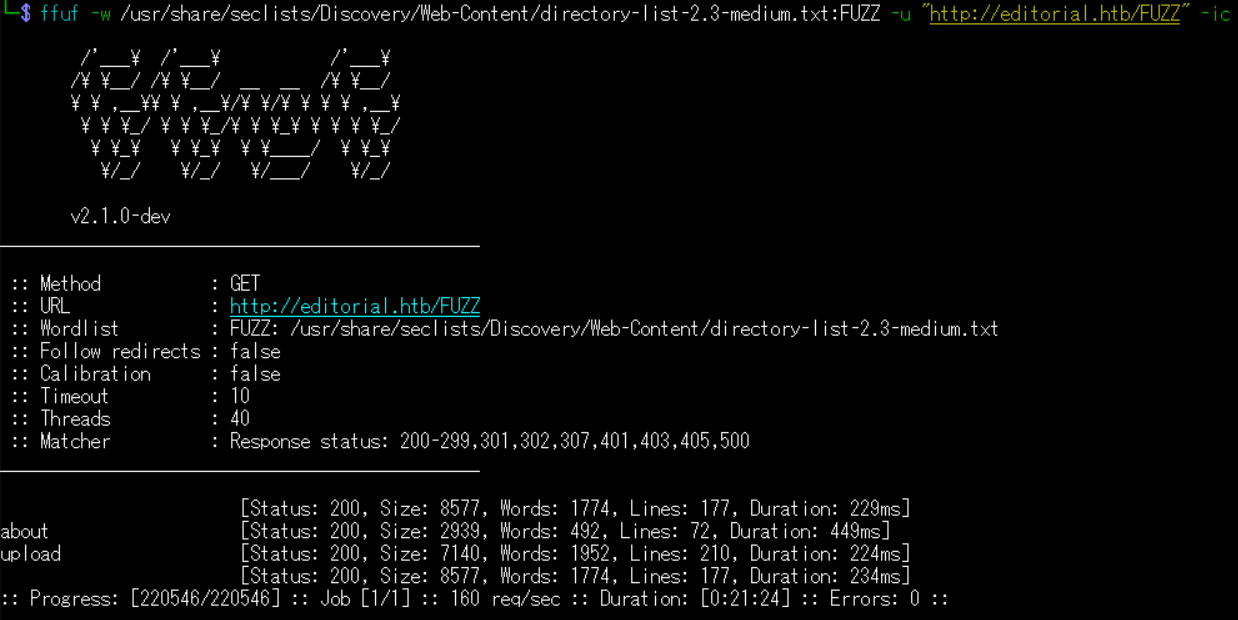 $ ffuf -w /usr/share/seclists/Discovery/Web-Content/directory-list-2.3-medium.txt:FUZZ -u "http://editorial.htb/FUZZ" -ic