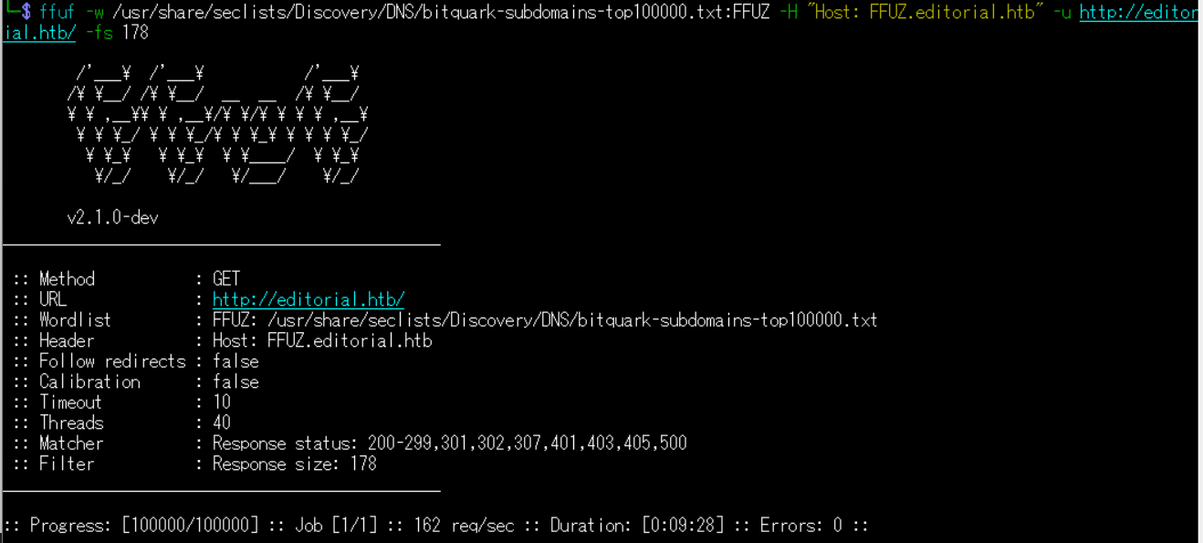 $ ffuf -w /usr/share/seclists/Discovery/DNS/bitquark-subdomains-top100000.txt:FFUZ -H "Host: FFUZ.editorial.htb" -u http://editorial.htb/ -fs 178
