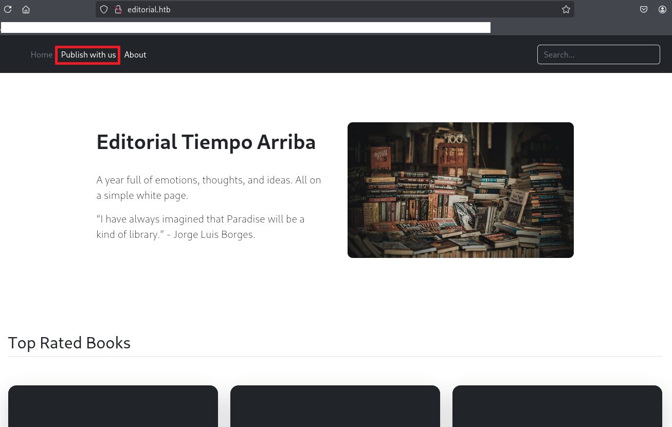 (1) ブラウザを用いて「http://10.10.11.20/」にアクセスすると、「http://editorial.htb/」にリダイレクトされる。