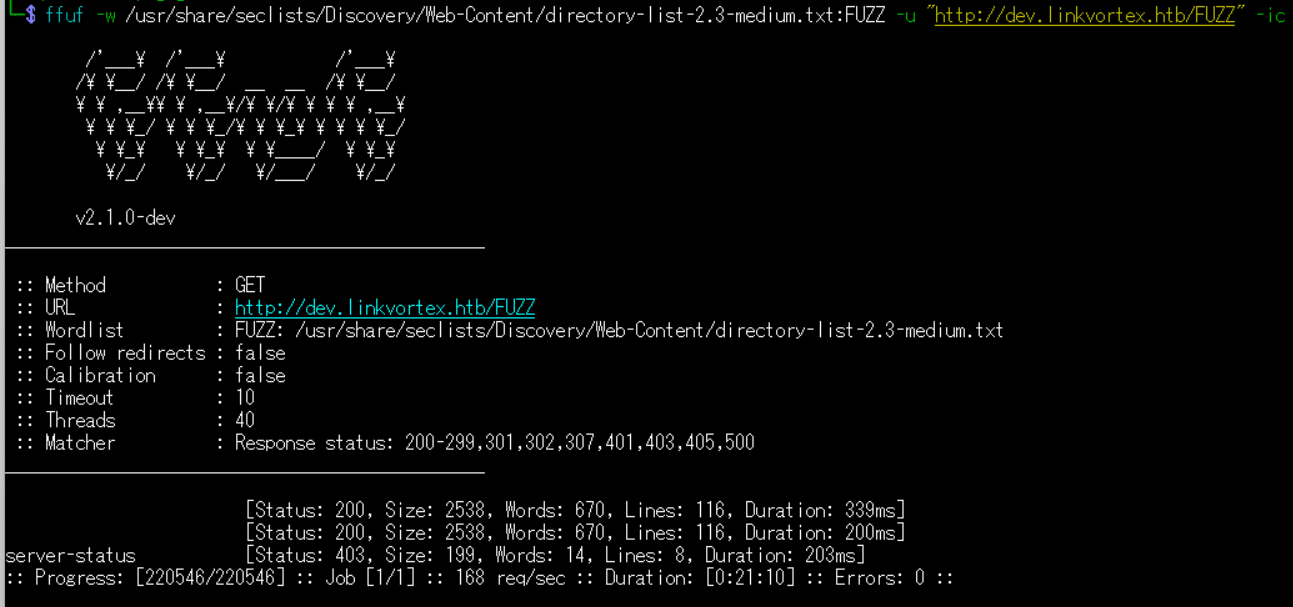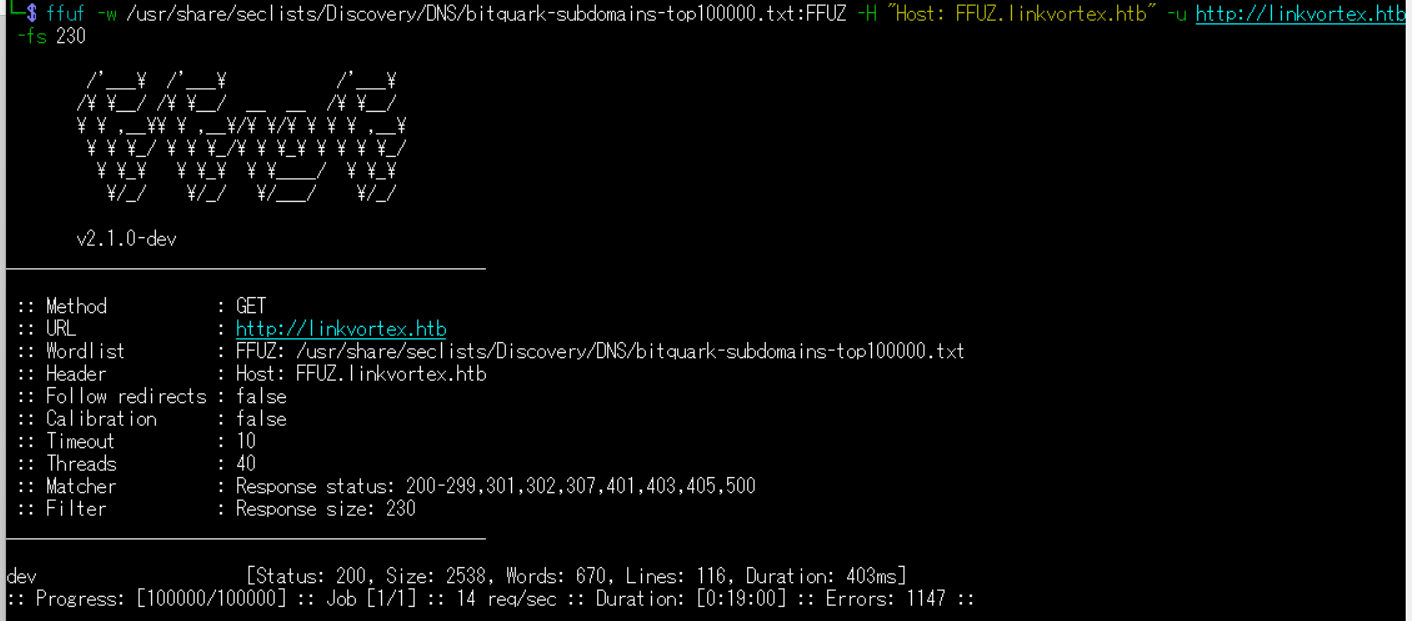 (1) ffufを用いてアクセスできるlinkvortex.htbのサブドメインを調査すると、dev.linkvortex.htbがあることが分かる。