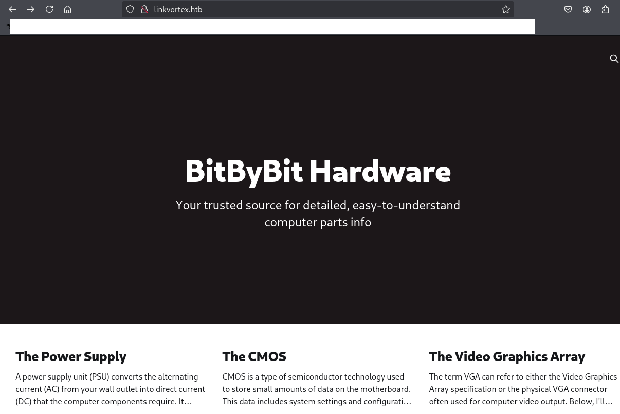 (3) ブラウザを用いて「http://linkvortex.htb/」にアクセスすると、Webページが表示される。