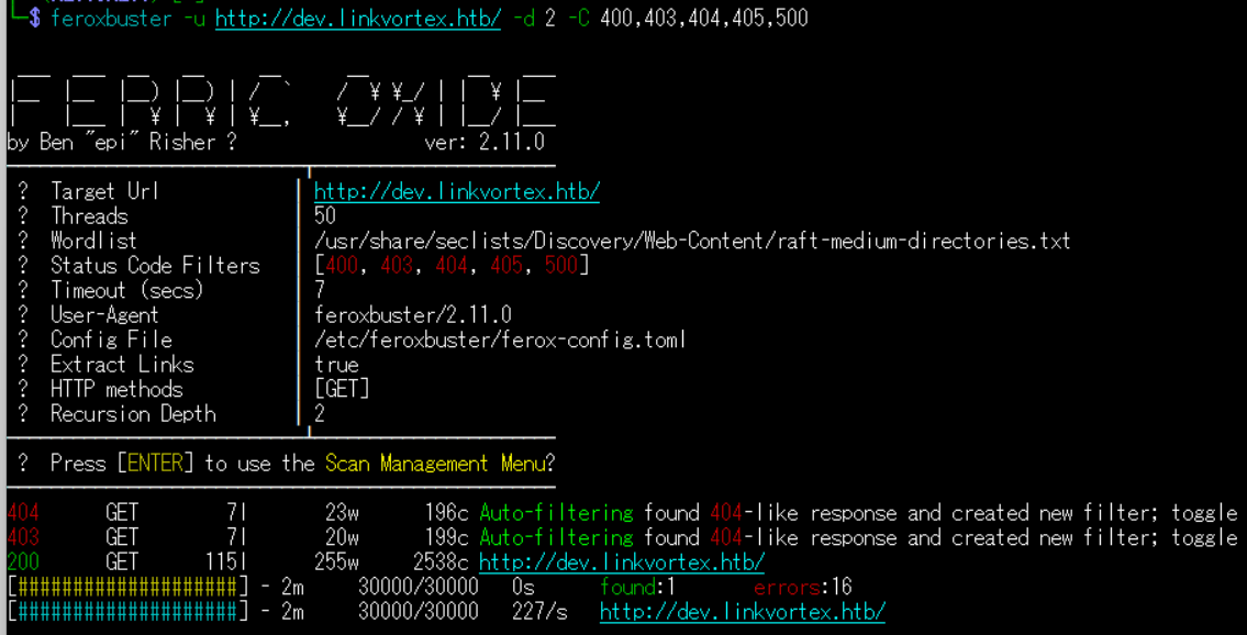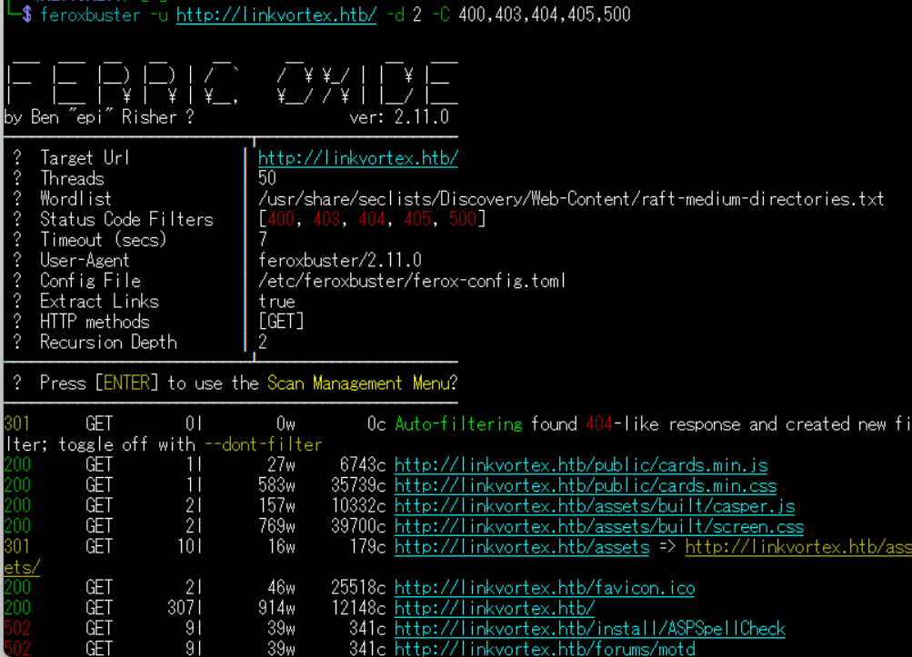 $ feroxbuster -u http://linkvortex.htb/ -d 2 -C 400,403,404,405,500