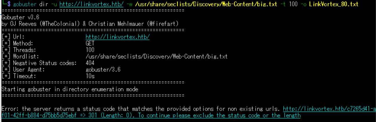 $ gobuster dir -u http://linkvortex.htb/ -w /usr/share/seclists/Discovery/Web-Content/big.txt -t 100 -o LinkVortex_80.txt