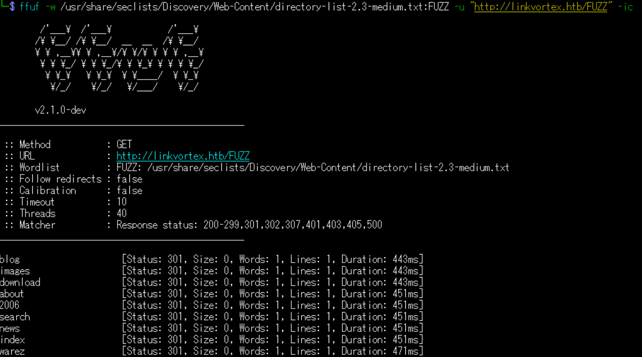 $ ffuf -w /usr/share/seclists/Discovery/Web-Content/directory-list-2.3-medium.txt:FUZZ -u "http://linkvortex.htb/FUZZ" -ic