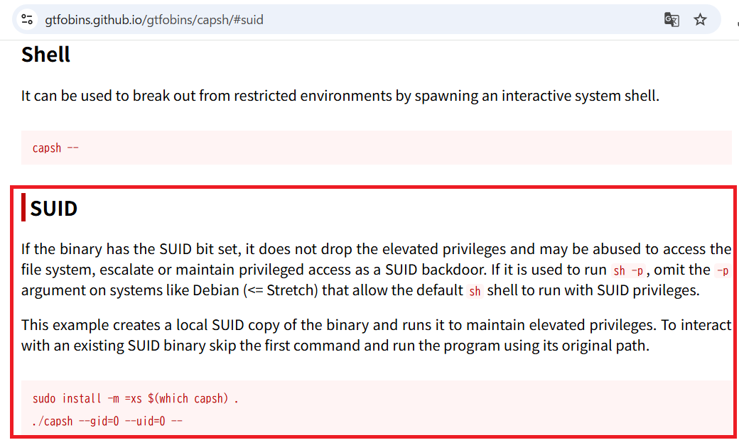 問題(日本語訳):Docker コンテナ内のどのバイナリに SUID ビットが設定されており、コンテナ内でルート アクセスを取得するために悪用される可能性がありますか?