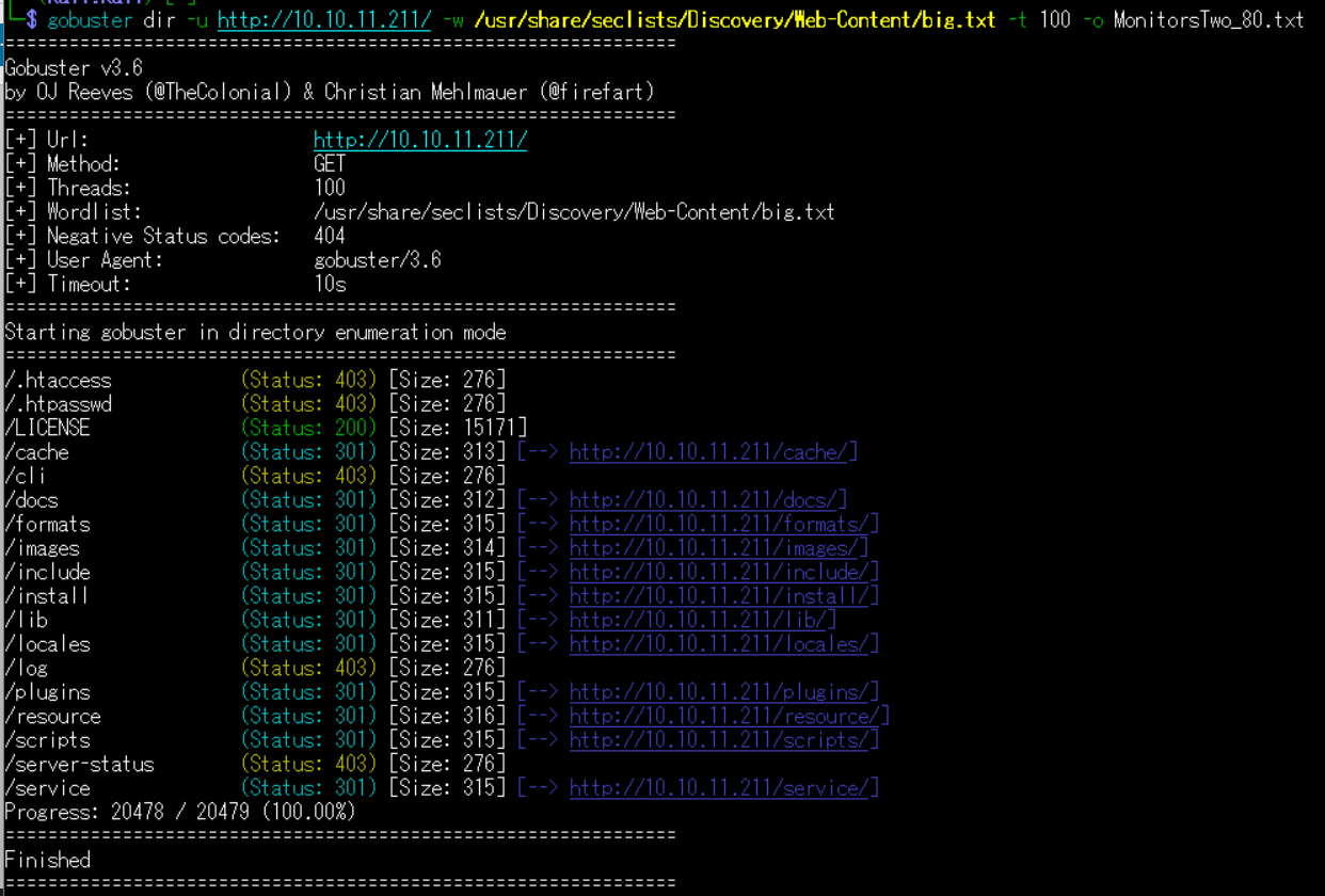 $ gobuster dir -u http://10.10.11.211/ -w /usr/share/seclists/Discovery/Web-Content/big.txt -t 100 -o MonitorsTwo_80.txt