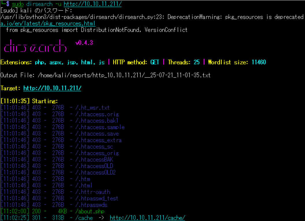 (3) dirsearchを用いてアクセスできるURLを確認するが、特に気になる内容はない。