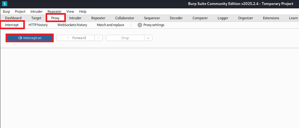 (1) Burp Suiteで [Proxy] > [Intercept] 画面にて「Intercept on」にする。