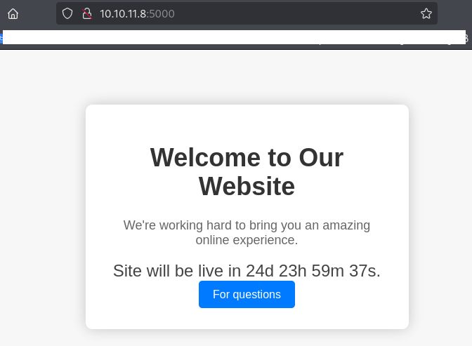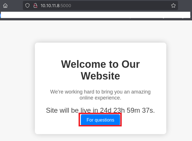 (1) ブラウザを用いて「http://10.10.11.8:5000/」にアクセスして、「For questions」をクリックする。