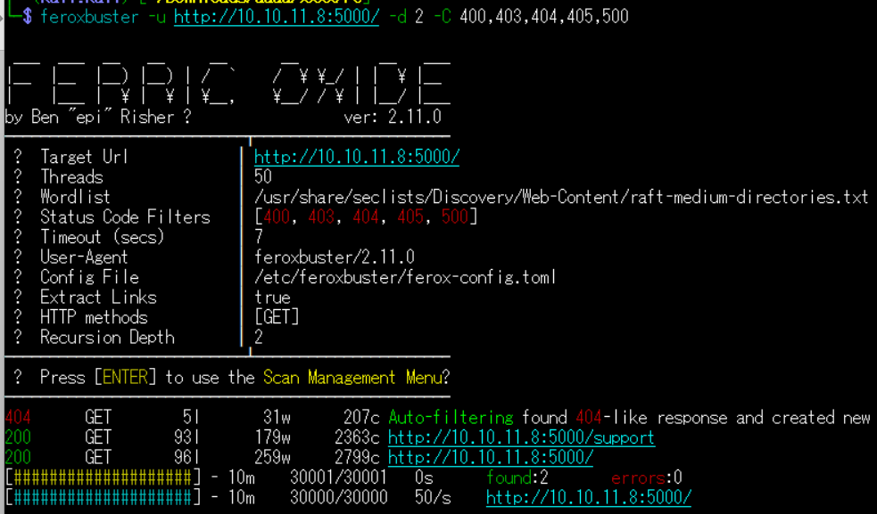 (1) feroxbusterを用いてアクセスできるURLを確認し、「http://10.10.11.8:5000/support」があることが分かる。