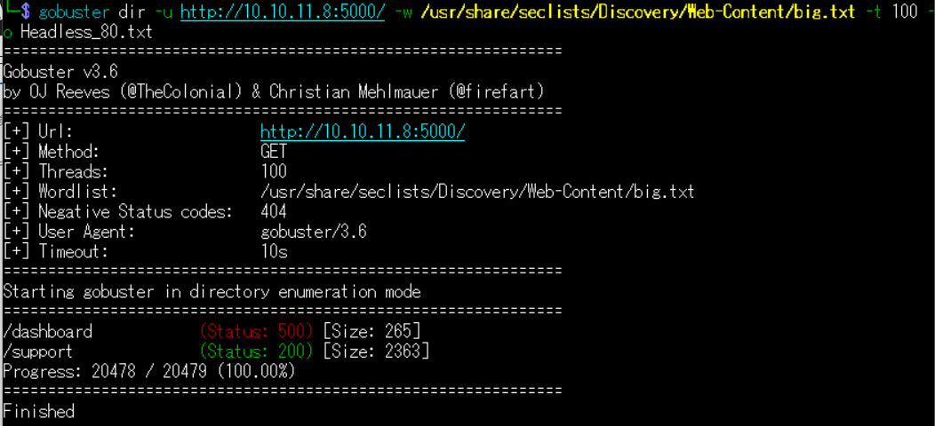 $ gobuster dir -u http://10.10.11.8:5000/ -w /usr/share/seclists/Discovery/Web-Content/big.txt -t 100 -o Headless_80.txt