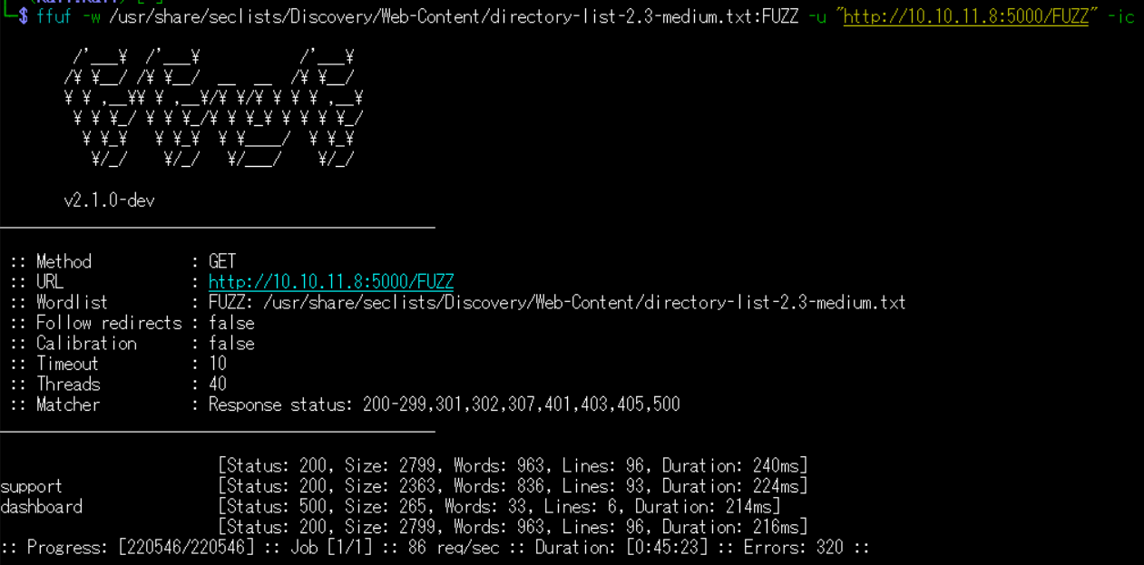 $ ffuf -w /usr/share/seclists/Discovery/Web-Content/directory-list-2.3-medium.txt:FUZZ -u "http://10.10.11.8:5000/FUZZ" -ic