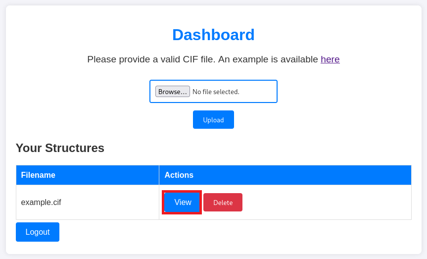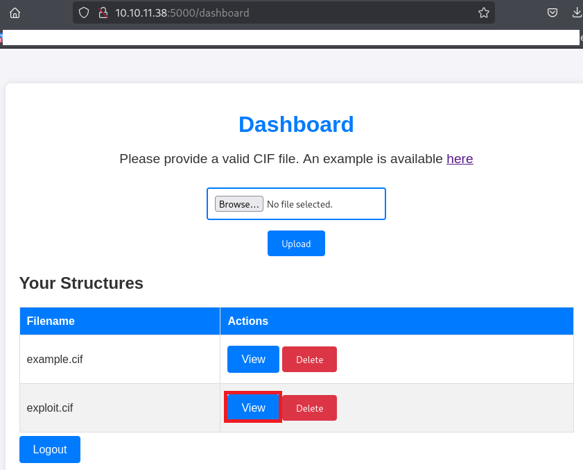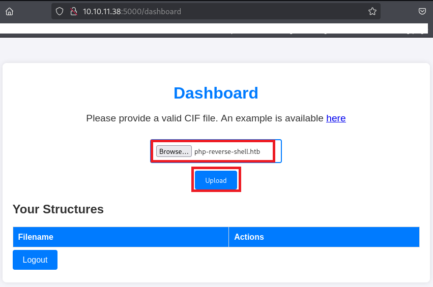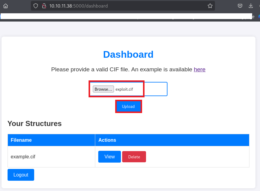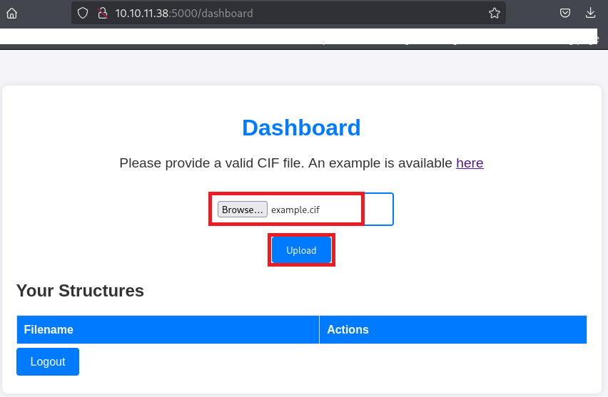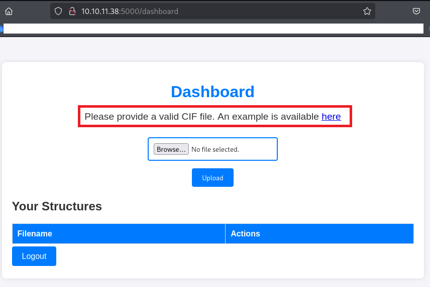 (6) ブラウザを用いて「http://10.10.11.38:5000/dashboard」にアクセスする。上部のメッセージを確認すると、CIF(Crystallographic Information File)ファイルのみアップロードできることが分かる。「here」をクリックしてサンプルファイル(http://10.10.11.38:5000/static/example.cif)をダウンロードする。